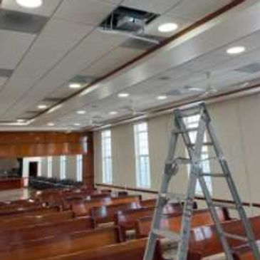 Instalación de videoproyectores sobre platabanda, plafón. Comunicación de proyector hacia conexiones de laptop. Instalación de pantalla de proyección, salida eléctrica, audio y video.